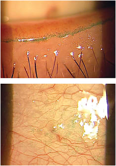 Subtle lissamine green staining on the lid wiper area and bulbar conjunctiva reveal some potential comfort concerns with contact lenses. I refit this patient into a daily disposable lens to improve this situation in order to prevent a potential contact lens dropout.