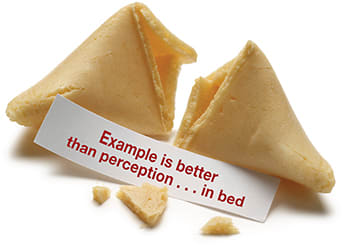 So, I had my son, Zach, a high school senior, follow suit. The fortune he opened read, “Example is better than perception . . . in bed.” After a few snickers from me, my honor student asked, “Huh?”
