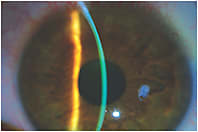 • Collagen crosslinking. Although not yet FDA-approved, CXL uses riboflavin drops combined with ultraviolet light to reinforce the structural weakness in the stroma. It flattens the cornea, improves BCVA and UVA and prevents disease progression. In countries where this procedure is performed, 96% of treated eyes achieve stable topographies with no disease progression. Two versions of CXL are undergoing assessment in the United States: (1) epithelial removal referred to as “Epi-Off,” and (2): trans-epithelial “Epi-On,” which leaves the epithelium intact. Both methods can stop keratoconus progression, with young patients being the best candidates.