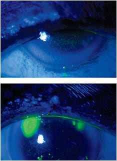 The top photo shows diffuse punctate epithelial keratitis stained with sodium flourescein. The bottom photo shows staining of severe keratoconjunctivitis sicca.