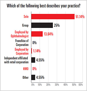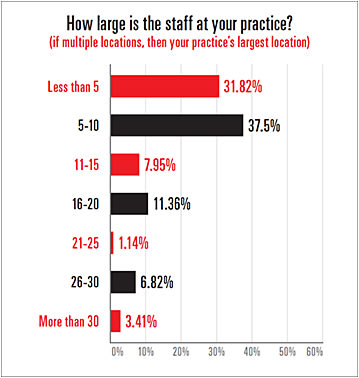 About half the respondents reported working solo in private practices, while another 25% reported working in group practices (see the chart on p. 19). Most respondents, 69.3%, worked at practice locations made up of 10 staff members or less (see the chart on p. 20). About 30% of respondents reported total annual practice revenues of more than $1 million, while 19.3% reported $250,000-$499,000 (see the chart on p. 20).