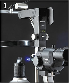 The D-KAT Z-type Digital Applanation Tonometer, from Keeler, aids in glaucoma diagnosis via IOP measurements at the slit lamp. ■
