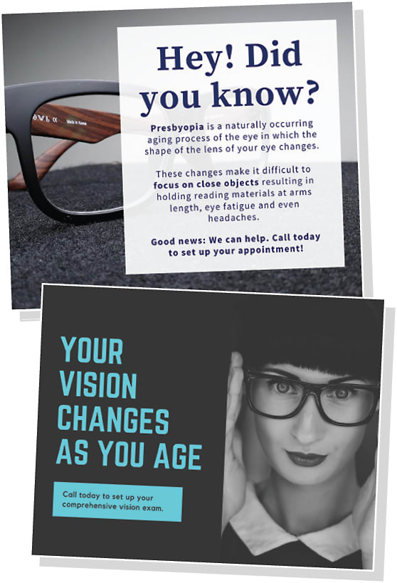 As optometrists and primary eye care providers, presbyopia is a significant aspect of aging patients may be grappling with in your office. As such, include information within your social media that educate on this natural aging process. For example:
