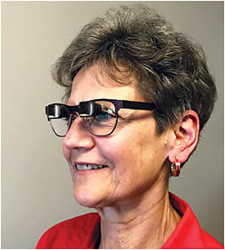 A few of Dr. Armstrong’s patients with low vision correction, from top: Rosemary wears 2.2X bioptic telescopic glasses. Katherine is shown with 4X bioptic telescopic glasses. Brian and Teresa wear 3X wide angle telescopic glasses. Mark wears telescopic glasses designed for reading. Bernard is shown with 4X bioptic telescopic glasses.