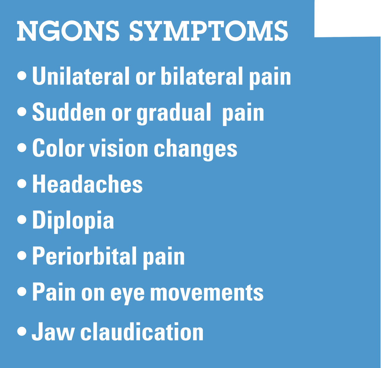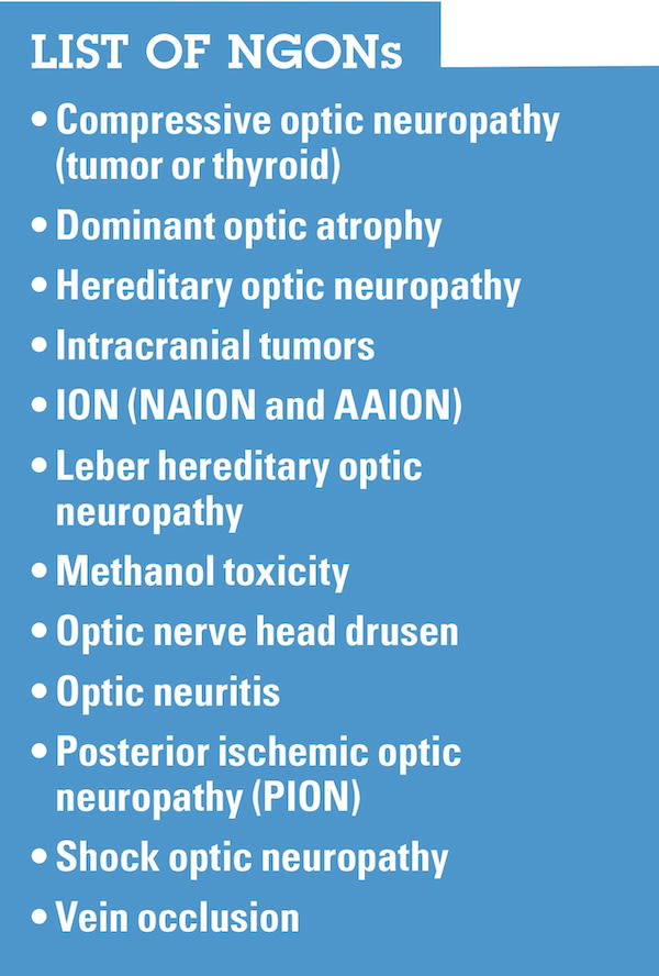 NGONs, on the other hand, can manifest in various ways. For example, optic neuritis presents with acute pain upon eye movement, color disturbances, and/or rapid vision loss. What’s more, ischemic optic neuropathy may result in sudden, painless vision loss. (See “Table 2: NGONs Symptoms.”)