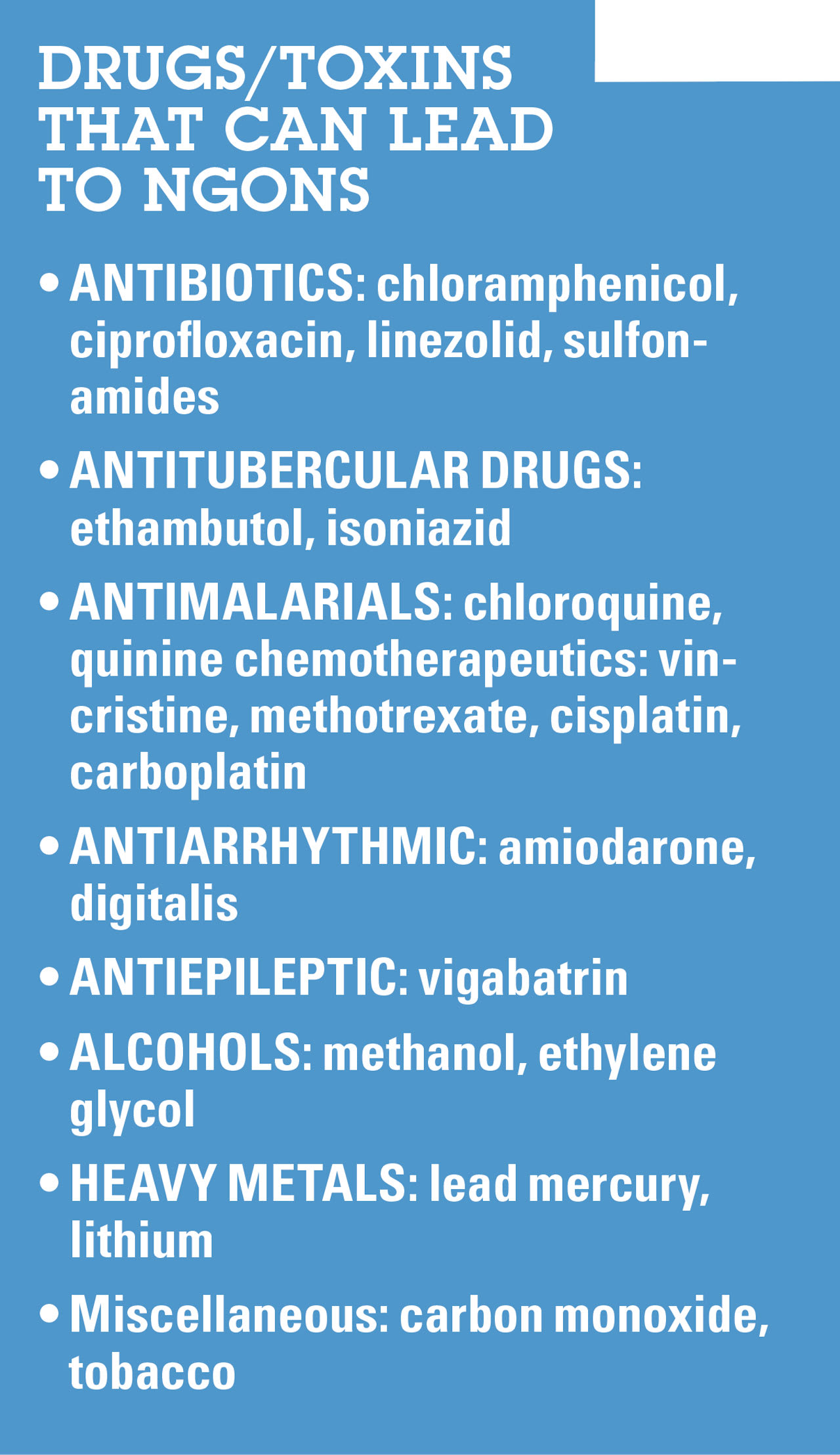 Several drugs, such as anti-leptics, and toxins, including antibiotics, and heavy metals, respectively, can lead to NGONs.5,6 Therefore, these compounds can signal a NGON. (See “Table 3: Drugs/Toxins That Can Lead to NGONs.”)