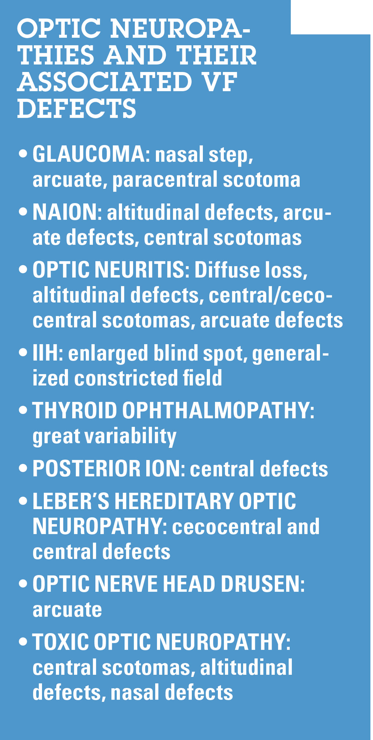 • VF. Glaucoma often exhibits arcuate scotomas, nasal steps, and paracentral scotomas. Notably, glaucomatous VF defects typically do not extend across the horizontal midline. Conversely, NGONs present with a variety of VF defects, such as enlarged blind spots, with central defects frequently observed.13-17 (See “Table 5: Optic Neuropathies and their Associated VF Defects.") If there is progressive VF decline despite well-controlled IOP, a neurologist consultation should be considered for neuroimaging of the patient.