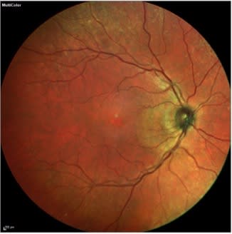Figures 1 and 2 show this patient’s relatively healthy macular appearance, with low suspicion for significant worsening of age-related macular changes. However, also note the area of the right retina adjacent to the optic nerve primarily where the papillomacular bundle originates in Figure 1. This area has slight elevation that is best seen in vivo at the slit lamp. Other than that subtle finding, the posterior poles in both eyes look unremarkable.
