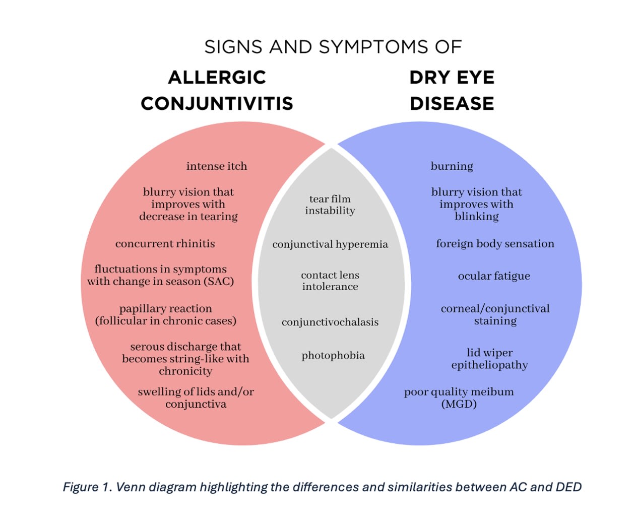 1. Obtain a thorough case history. While it is important to recognize the commonalities among allergic conjunctivitis and DED, it is equally important for the optometrist to remember the other causes of ocular discomfort and redness. Specifically, this clinical sign (redness) and symptom (discomfort), respectively, can also be found in infections, such as viral or bacterial conjunctivitis.