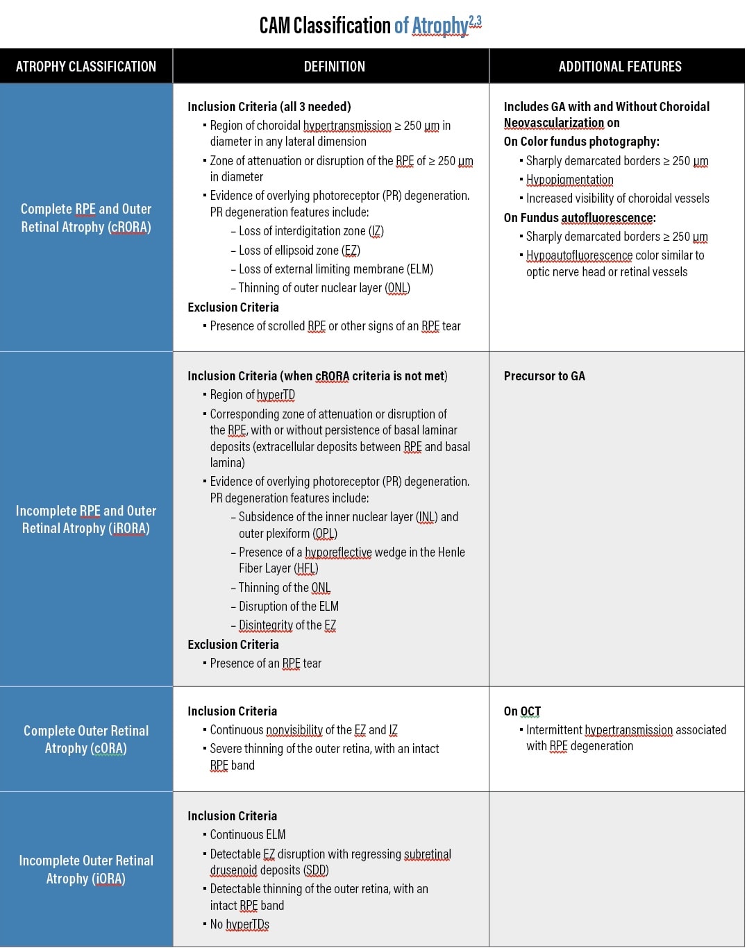 The Classification of Atrophy Meeting Group (CAM) developed definitions of atrophy (see CAM Classification of Atrophy," below) and assessed biomarkers in GA. Additionally, the group defined hypertransmission defects (hyperTDs) on OCT as “the presence of increased transmission of signal below the level of the RPE and into the choroid.”2