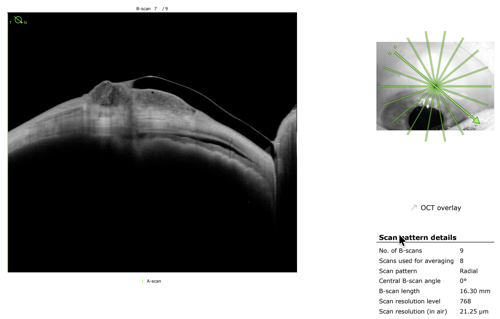 Examination revealed advanced corneal irregularity and a prominent irregular bleb. A scleral lens was indicated given her intolerance to corneal gas permeable (GP) lenses. However, the presence of the bleb complicated the fitting process. It was clear that the patient would need an impression-based scleral lens due to the level of regional customization needed, but this impression had to be taken over a soft, movable bleb. Thus, the integrity of the bleb filtration beneath the lens was uncertain. While slit lamp evaluation provided a surface-level assessment, it offered limited insight into how the lens affected intra- and sub-conjunctival space beneath.