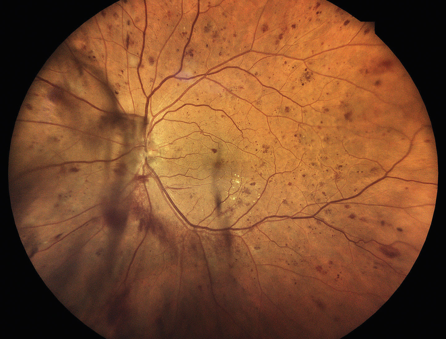 Severe NPDR is characterized by the “4-2-1” rule; that is, when all 4 quadrants of the retina have marked microaneurysms or hemorrhages, 2 quadrants have venous beading, or 1 quadrant demonstrates prominent IRMA (Figure 3). If 2 of the above criteria are met, the patient is classified as having very severe NPDR.6