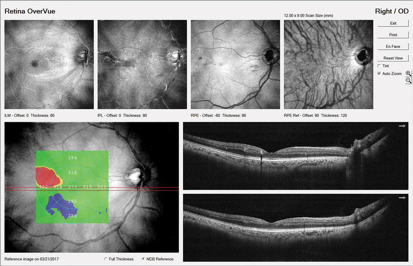 An important caveat regarding staging: Diabetic macular edema (DME) can occur at any stage of retinopathy, from mild NPDR all the way through proliferative disease.10 Diabetic macular edema remains the leading cause of moderate vision loss in patients who have type 2 diabetes, exceeding the vision loss from frank retinopathy. What’s more, it is estimated that nearly 745,000 people, or 3.8% of all patients who have diabetes in the United States, have DME. However, 55% of these patients are unaware they have it, underscoring the importance of detection even in asymptomatic patients.11 Therefore, careful evaluation of the macula for any exudation and/or thickening with optical coherence tomography (OCT) is crucial in all patients who have diabetes.12 Patients who have center-involved DME (ie, the center 1 mm subfield on the OCT showing edema; Figure 7) should be referred to a retinal specialist for consideration of treatment within 2 to 4 weeks.