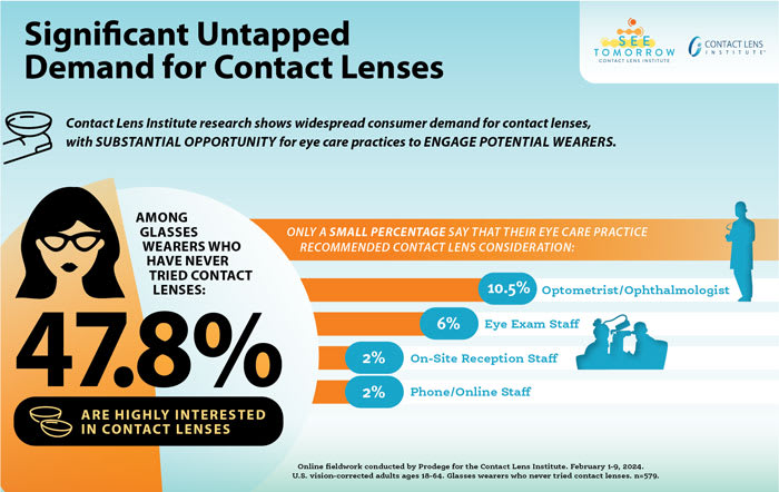 Simple adjustments to how eye care practices communicate with spectacle-wearing patients may increase the number of contact lens wearers, according to new data from the Contact Lens Institute (CLI). Specifically, the findings show one in 10 (10.5%) glasses wearers said their optometrist or ophthalmologist recommended contact lenses, with lower rates for exam staff (6%), optical/eyewear display staff (3%), and administrative staff (2%). CLI is previewing this research at Vision Expo East this week, and publishing an in-depth report in April.