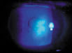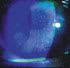 - Next, instill fluorescein and evaluate the dye pattern with the biomicroscope. An HSV-1 dendritic lesion stains brightly and the fluorescein absorbs slowly into the surrounding tissue (see middle photo on pg. 49). Rose bengal or lissamine green presents a distinctive stain pattern. Most lesions will stain faintly in the center, darker at the border and again fainter or less dense outside of the border. Note the typical rose bengal stain pattern in the top photo below.