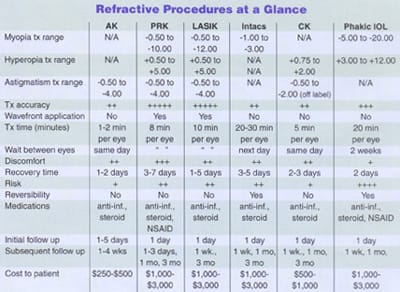 It's easy to become confused with so many options currently available to treat ammetropia. Each has its own strengths and weaknesses. Table 1 summarizes the important characteristics of each and is intended for use as a quick reference. It's important for you to weigh the risks and benefits of each based on the patient's expectations and motivations for the patient to make the right decision.