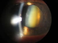 | From top to bottom: 1. The "macro" setting is used without the slit lamp to document the correct placement of an Optech aniridia IOL (photo courtesy of Scott Sykes, M.D.) 2. A corneal erosion is easily seen here and documented to monitor healing, as well as for patient education. 3. The progression of corneal neovascularization can be closely followed. 4. A brunescent cataract is photographed with an optic section. 5 This post-LASIK SPK is well documented through the slip lamp with a cobalt filter. |