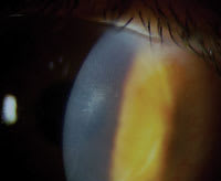 An established patient reported to the office with corneal trauma. Two days prior, the patient had an accident in which soap squirted on to the front surface of the right eye. He reported considerable pain, decreased vision and photophobia, none of which were improving. We diagnosed the patient with a large corneal abrasion (see figure 1).