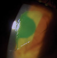 We coded the initial visit with the appropriate level evaluation and management visit code, 99213 in this case, and code 92070 for the fitting and supply of the bandage lens, as well as code 99285 for anterior segment photography. The diagnosis codes for this example were corneal abrasion (918.1) and secondary iritis (364.04). The patient had several follow-up visits where we assessed corneal health with biomicroscopy and high mol-ecular weight fluourescein through the lens, but did not remove the bandage lens (see figure 2).