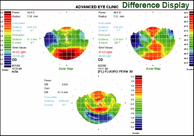 Interestingly during this process, a fairly marked amount of central corneal astigmatism manifested. The difference map clearly shows how the new contact lens centered over the cor-neal apex, allowing the shape of the eye to return to normal (see figure 4). The previously steepened inferior cornea flattened, while the previously flattened central cornea steepened. This corneal rehabilitation also resulted in the removal of spectacle blur and enabled the patient to start interchanging an eyeglass prescription in the evening, which allowed the eye to further stabilize.