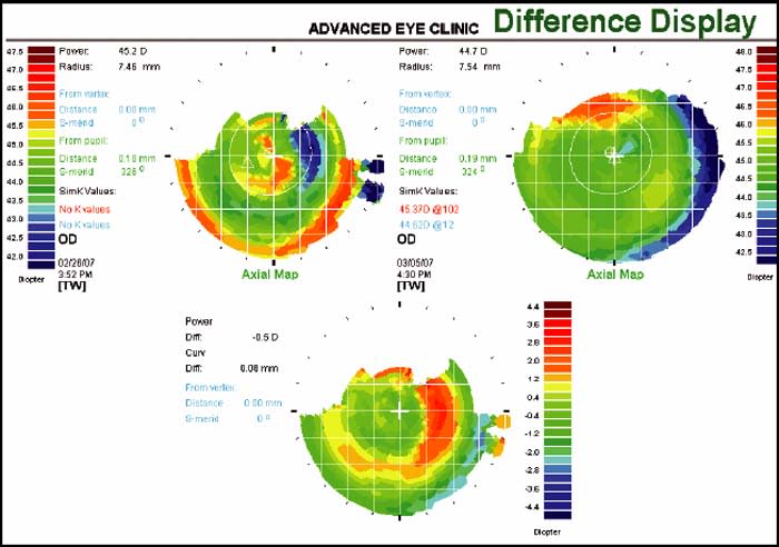 | Figure 1 (right): Spherical cornea after replacing a high-modulus silicone hydrogel contact lens that was worn inside out. Figure 2 (left): Difference map demonstrates the rehabilitation effect of a high modulus silicone hydrogel lens in the proper position. |