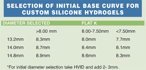 In our office, we've found that a base curve based on the flattest corneal curvature and diameter is a good choice. For a 13.2mm diameter CL, initially select an 8.3mm base curve for corneas 8.0mm or flatter, 8.0mm for corneas between 8.00- and 7.50mm and a 7.7mm base curve for corneas steeper than 7.50mm. (See "Initial CL Selection" below and "Selection of Initial Base Curve for Custom Silicone Hydrogels," page 58.) Once you evaluate the initial CL on the eye, make adjustments if necessary, based on your observation of the fit.