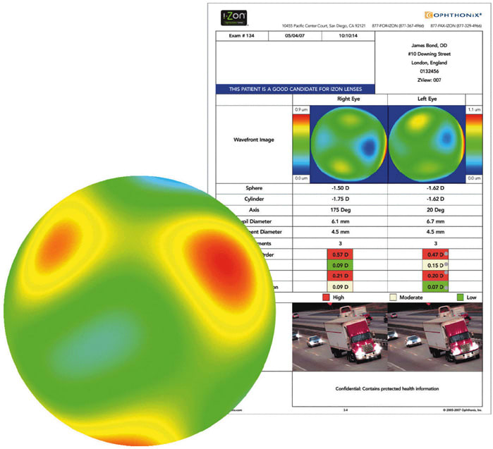 | Many of us have bought the GDx nerve fiber layer analyzer or the optical coherence tomographer (OCT), believing that these instruments were worth having in our practices. But this equipment doesn't drive patients to our door. I've never had anyone show up in my office saying, "I've got to have a GDx scan today!" However, I've had patients come in saying, "Gee, I've heard about this wavefront technology, and I really want to know more about it." The iZon technology is more intriguing to patients. Instead of driving them away because of price, it has them lining up at your office waiting to take their turn. |