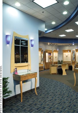 Optometrist Jacqueline Campisi, of Visions Sight & Learning Center in Mystic, Conn., says the most outstanding part of her Egyptian-themed practice is the pyramid-shaped waiting area and domed ceiling of the optical boutique (right). "A floor-to-ceiling mural of a doorway peering out at the desert backdrop from the pyramid catches patients' eyes as they approach the reception area," she says. "Wall sconces produce a low amber glow, as if the pyramid were lit by torches, and frame displays are made from imported Egyptian furnishings." The location of Dr. Campisi's practice was key to her success. Situated in the lower corner of a medical complex, the practice has 40-feet of window frontage facing a Starbucks.