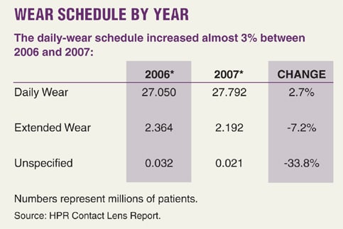 The extended-wear schedule decreased 7.2% between 2006 and 2007, while the daily wear schedule increased by almost 3% (2.7%). (See "Wear Schedule By Year," below.)