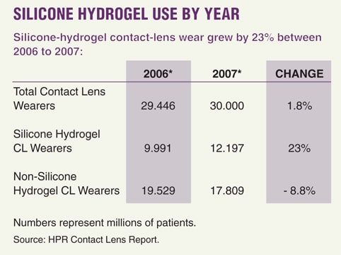 Data gleaned on the contactlens (CL) market for the year 2006 to 2007 revealed three stories: silicone hydrogel (SiHy) CL use significantly increased, risk of infection may have played a role in wear schedule and modality choice, and the number of patients wearing enhancing CLs declined.