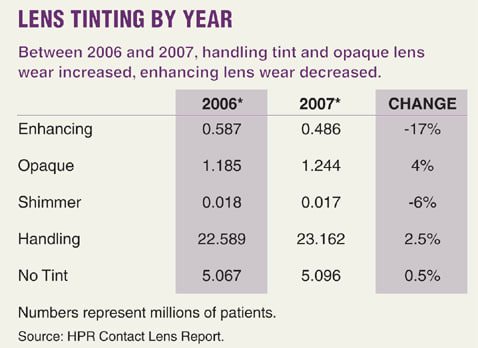 Enhancing lens wear dropped by 17.2% between 2006 and 2007, and the total category dropped 2.4%. (See "Lens Tinting By Year," below.)