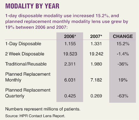 The use of the 1-day disposable modality increased by 15.2%, and planned-replacement monthly modality lens use increased by 19% between 2006 and 2007. Further, two-week disposable-lens modality use decreased slightly (1.4%), while traditional/reusable lens modality use shrunk 36%, and planned-replacement quarterly lenses plummeted 63%. (See "Modality By Year," below.)