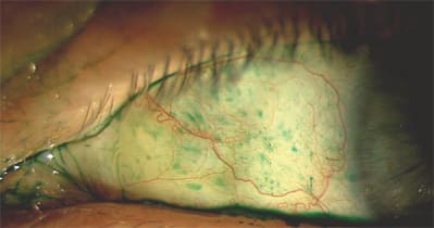 Lissamine green staining shows Grade 1 staining in the inferior and nasal region of the eye. Hypothetical Presentation At the next visit, if the previous improvements in clinical signs and symptoms are maintained, the clinician should consider an individualized longer-term management plan. Such a plan could involve continued lid hygiene and tailored, less frequent maintenance dosing of topical azithromycin. Alternatively, it would be feasible to discontinue topical azithromycin to determine whether lid hygiene alone controls signs and symptoms. If signs and symptoms reappear at a future follow-up visit, topical azithromycin can be restarted. If the patient had presented with a reduced Schirmer score or more significant corneal staining, lubricants and/or topical cyclosporine ophthalmic emulsion 0.05% (Restasis, Allergan) therapy could be initiated per the DEWS treatment paradigm.