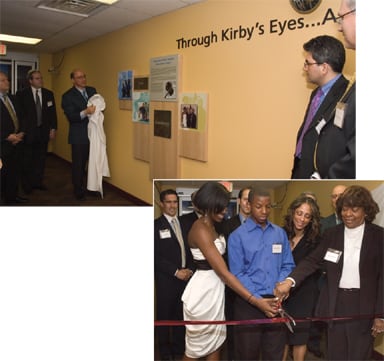 Above: Members of Pfizer Ophthalmics reveal the interior of the Center. Below: Kirby's children Catherine and Kirby Jr. join mom, Tonya, and June Sinkfield (Kirby's sister) to cut the ceremonial ribbon.