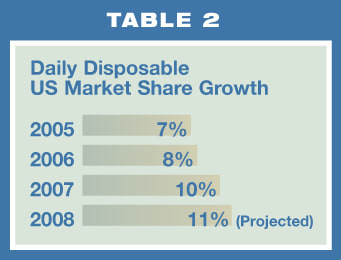 The U.S. soft contact lens market grew by 6% in 2007, according to CIBA Vision marketing data. During that same time, the daily disposable market grew by 30%, beating even silicone hydrogels, which expanded at 20%. Meanwhile, daily disposable growth in Japan was reported at 10% and in Europe only 4%. Some industry analysts predict continued yearly growth of 20% or more in the United States over the next several years, which amounts to an increase in overall market share of 1% a year.4