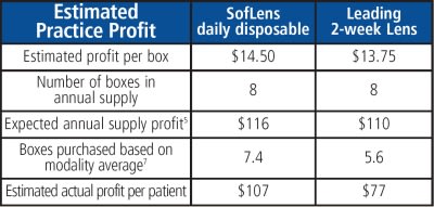 The practice also has the opportunity to profit from the sale of an annual lens supply. With the SofLens daily disposable, the profit to the practice from an annual supply can be greater than that derived from an annual supply of the leading 2-week lens, even when the 2-week patient is compliant. When comparing sales to patients who purchase the average annual number of boxes for their modality, SofLens can be even more profitable, as shown in the example below.7