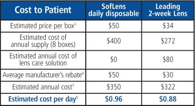 What makes this daily disposable even more unique is its affordability. The leading 2-week lens costs a patient about 88 cents a day, based on the cost of an annual supply and the cost of lens care solution. With Bausch & Lomb's high-value rebate program and no solution costs, your patients can experience the advantages of the SofLens daily disposable for about 96 cents a day — a difference of only $28 a year.