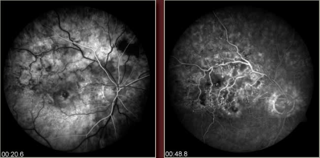 Recent study results show promising treatments for patients who have retinal vein occlusion, which is depicted in these fluorescein angiography images.