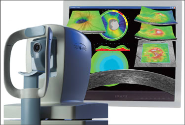 • RTVue (Optovue) — The RTVue completes 51,700+ A-scan 3D imaging in 2.2 seconds. Physicians can review a 3D presentation, rotate the images, rapidly scan through B-scans and zoom in for a better view. The system offers full retinal, inner retinal and outer retinal thickness maps and metrics, as well as a 0.35-second complete nerve head analysis for glaucoma diagnosis. It's the only commercially available OCT system that's FDA-approved for both corneal and retinal imaging.