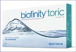 Biofinity Toric MATERIAL: Comfilcon A DK/T: 116 DK: 128 WEARING SCHEDULE: Extended wear or daily wear RECOMMENDED REPLACEMENT SCHEDULE: Monthly BASE CURVE: 8.7mm DIAMETER: 14.5mm PATIENT COST: $59.99 per box |