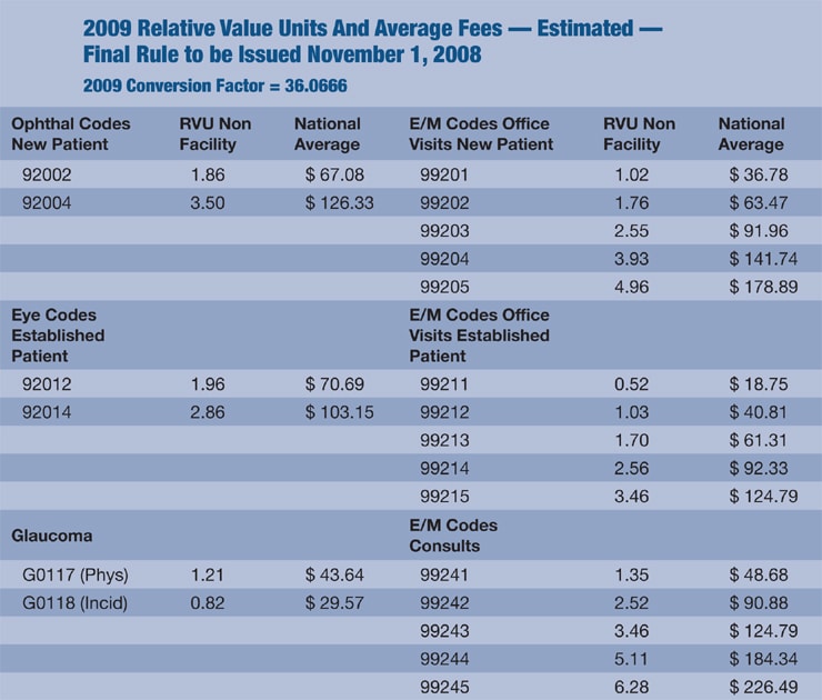 The dollar figures given are national averages. For 2009, the budget neutrality adjuster for the work RVUs is incorporated into the conversion factor. CPT Codes copyright 2008 American Medical Association.
