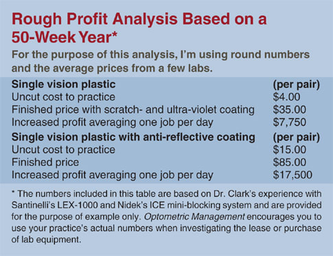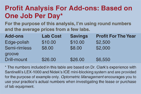 Think back again to your lab bill. Now, pay particular attention to the additional fees for edge polishing, grooving, drill mounts, ultra-violet protection and scratch-resistant coating. Add-on costs are probably one of the main profit centers for your current lab that could be yours — if you employ your own in-office lab. (See "Profit Analysis for Add-ons: Based on One Job Per Day," below.)