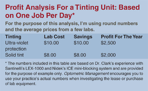 A tinting unit can provide additional income as well. I've found that outside labs charge between $15 to $18 to perform this service (i.e. dipping the lens in a UV chemical for 15 minutes). The bottle of the UV chemical costs between $15 to $18 and lasts four to five months. I've had several patients purchase new eyewear and express concern regarding what to do with their old eyewear. Having the tinting unit enables me to give these patients the option of turning their old spectacles into sunwear. While this isn't a true multiple pair sale, it has increased my per-patient revenue. (See "Profit Analysis for a Tinting Unit: Based on One Job Per Day," below.) In addition, patients tell me they greatly appreciate the service. This has not only created patient loyalty to my practice but some referrals as well.