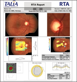 Optometrists also should have knowledge of the diagnostic equipment used in retinal care. Dilated fundus exams are central to screening patients for signs of retinal pathology and monitoring after retinal procedures, but specialized equipment can expand the optometrist's role in comanagment. A fundus camera, for example, is helpful for monitoring changes over time. “Often, no specialized equipment is needed, but what instruments you do or don't have should be discussed with the specialists with whom you plan to work,” Dr. Warren says. As part of his clinical exam protocol, Dr. Warren uses the Talia Retinal Thickness Analyzer (RTA 5) for screening and for comparing the status of the macula from visit to visit.