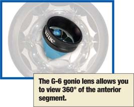■ The G-6, from Volk Optical, is a 1.0x magnification gonio lens with six 63° equally angled mirrors, enabling a 360° view of the anterior segment. During the glaucoma screening, two mirrors are aligned in the superior and inferior regions, while the other four mirrors provide a continuous view through the nasal and temporal regions. The no flange/no fluid design lens comes with a ring or a two-in-one adjustable handle to create a straight or 45°-angled grip.