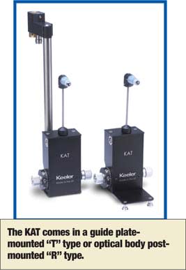 ■ The Keeler applanation contact tonometer (KAT), from Keeler Instruments, uses the Gold-mann method of measuring IOP, employing a prism mounted on the tonometer head and placed against the cornea. The device is compatible with most slit lamps, the company says, and comes in a guide plate mounted "T" type or optical body post-mounted "R" type.