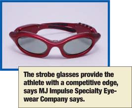 ■ Strobe glasses, from MJ Impulse Specialty Eyewear Company, are strobing glasses that stress, or load, the visual perceptual, visual motor and visual proprioceptive systems during training. This gives the athlete a competitive edge, the company says. Specifically, the glasses help athletes achieve enhanced visual concentration, eye-hand coordination and proprioceptive balance, the MJ Impulse Specialty Eyewear Company, says.