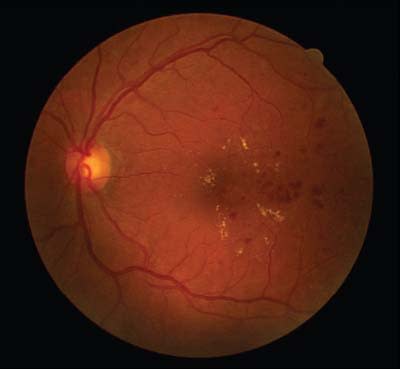 This patient displayed mild to moderate non-proliferative diabetic retinopathy.