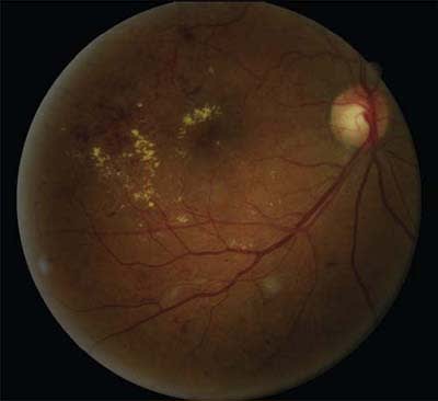 His best-corrected visual acuity is 20/20 OU. Evaluation of the fundus reveals dot hemorrhages and microaneurysms OU. I ask the patient: “Have you ever been tested for diabetes?” He replies: “No.” I then explain to him that I'm noticing changes in his retinae that indicate he may have diabetes. I ask him about recent weight changes, increased thirst and urination — other symptoms of the disease, which he denies experiencing. Next, I strongly recommend he see his primary care physician for a diabetes work-up. I hand him my card and tell him to have his doctor call me once he secures an appointment. The patient tells me he doesn't have a regular doctor due to his traveling.