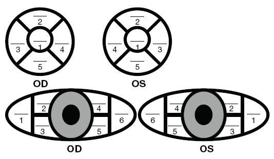 The ocular surface exam can be accomplished rapidly, especially if you use a check-box format on the examination form. Be sure to include an N/A box for tests not performed on a particular visit. Use a standard 0 to 4 grading scheme for tests and symptoms (e.g. 0 = patient experiences symptom none of the time, 4 = experiences symptom all of the time), as well as a staining grid for the cornea and conjunctiva (see Figure 1 below).